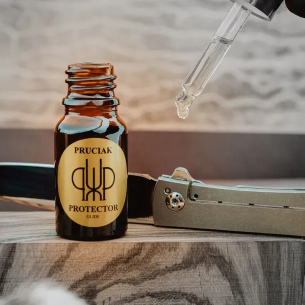Olejek do noży Pruciak Protector Glide dostarczany jest w poręcznej buteleczce o pojemności 10 mm z zakraplaczem służącym do łatwej aplikacji na wybranych elementach.
